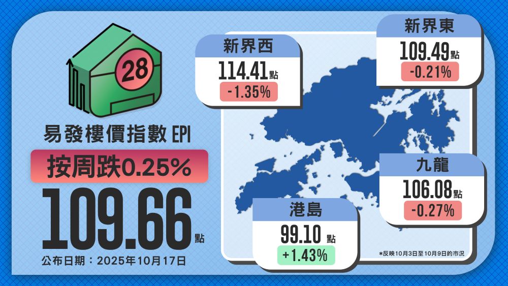 本港樓價持續橫行整固,最新易發樓價指數報109.66點,按周跌0.25%,年內累升約2.93%,較2021年高位低約33%。減息周期重啟帶動買氣回升,二手成交增多,樓市氣氛改善。分區方面呈「三跌一升」格局,新界西回吐最明顯,港島則受新盤帶動上升。租金方面,易發租金指數報116.33點,短期或於115至118點區間窄幅波動。
