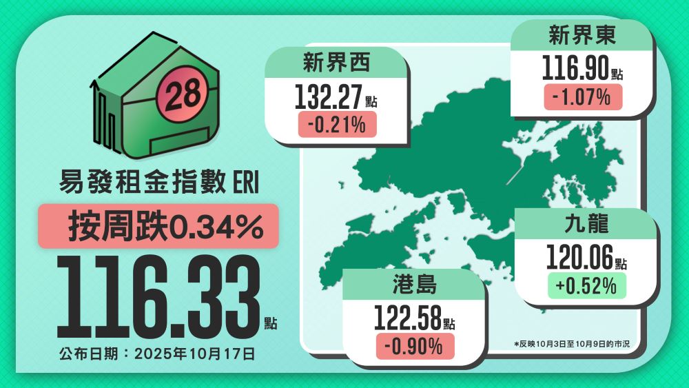 隨着租賃旺季結束,租金走勢略見放緩。最新易發租金指數報116.33點,按周微跌0.34%,惟已連續10周維持在116點水平,反映租賃市場仍具一定支撐力,尤其受內地學生租賃需求帶動。隨銀行相繼下調按揭息率,市場普遍預期年內或再度減息,置業成本進一步下降,吸引部分租客「轉租為買」,令租賃需求略為回軟。
