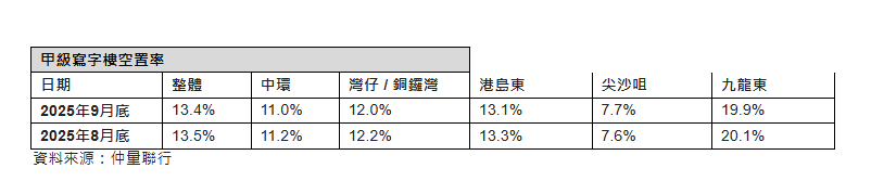 值得注意的是,上海商業銀行於啟德AIRSIDE租用71,863平方呎(建築面積)作整合之用。截至九月底,整體寫字樓空置率輕微回落至13.4%,多數分區市場均見改善。中環及灣仔/銅鑼灣的空置率分別改善至11.0%及12.0%。相反,尖沙咀的空置率則上升0.1個百分點至7.7%。