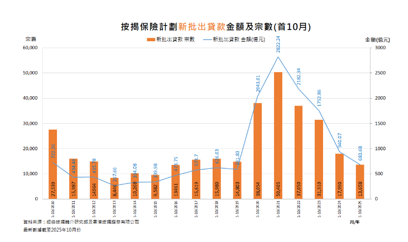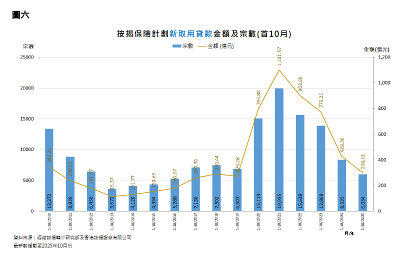 以首10個月比較,2025年首10個月新批出按保貸款宗數及金額為13,658宗及683.68億元,比去年同期的17,990宗及940.07億元,下跌4,332宗(24.1%)及256.39億元(27.3%),宗數創近9年首10個月新低,金額創近6年首10個月新低(圖五)。