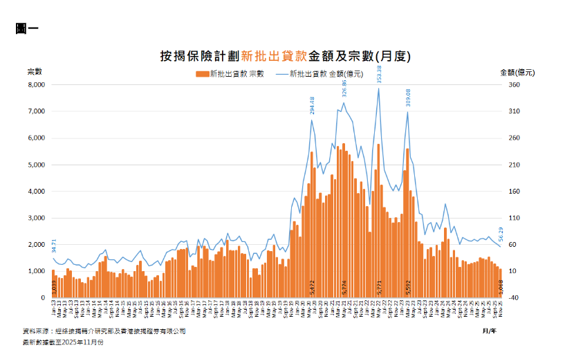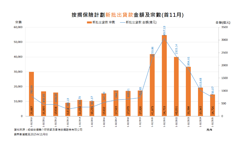 以首11個月比較,2025年首11個月新批出按保貸款宗數及金額為14,726宗及739.97億元,比去年同期的19,345宗及1,010.48億元,下跌4,619宗(23.9%)及270.51億元(26.8%),宗數創近10年首11個月新低,金額創近6年首11個月新低。