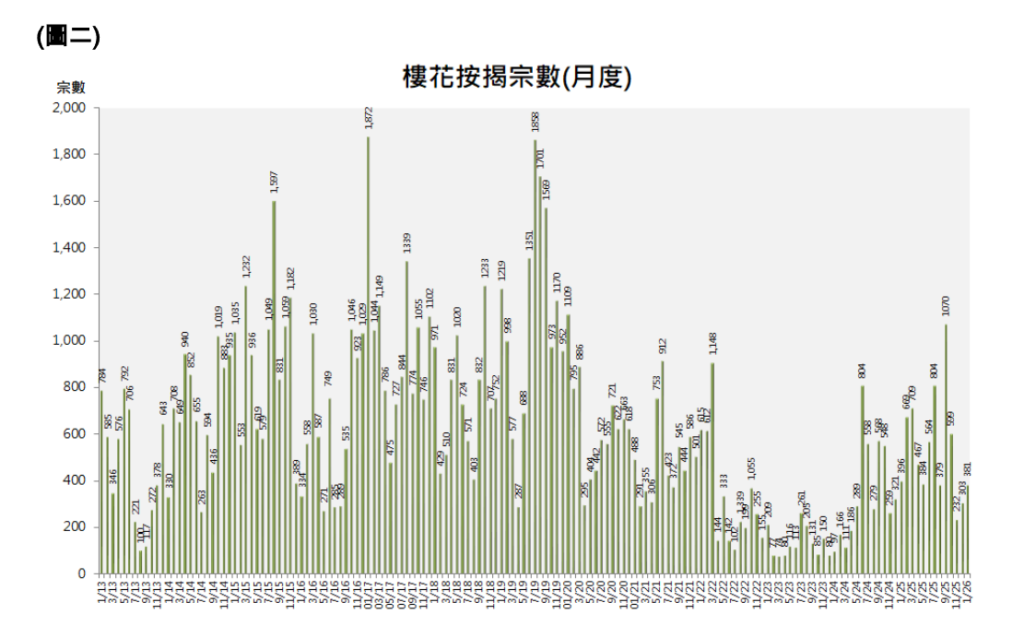 根據經絡按揭轉介研究部及土地註冊處最新資料顯示,2026年一月份現樓按揭宗數為8,022宗,較2025年十二月份的5,082宗增加2,940宗(57.9%),連升2個月,創逾兩年半(31個月)新高;而該月的樓花按揭宗數為381宗,較2025年十二月份的303宗增加78宗(25.7%),連升2個月,創3個月新高。