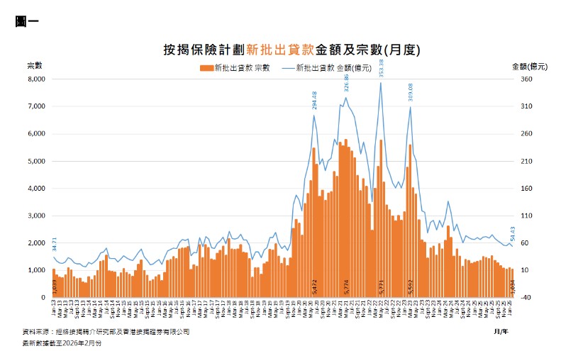 另外,新取用按保個案中,一手物業佔比為35%,二手物業佔比為65%。2026年2月份新批出按揭保險計劃貸款宗數及金額為1,034宗及54.43億元,較1月份的1,100宗及59.4億元,宗數及金額分別減少66宗(6%)及4.97億元(8.4%),宗數創逾7年(86個月)新低,金額創近6年半(77個月)新低。