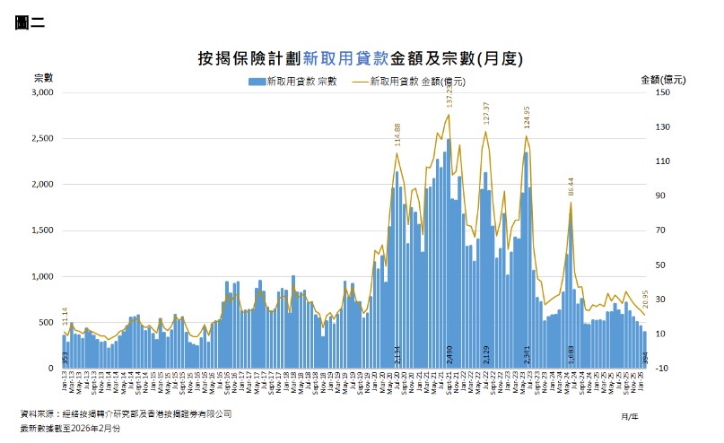 根據經絡按揭轉介研究部及香港按揭證券有限公司最新資料顯示,2026年2月份新取用按揭保險計劃貸款宗數及金額為394宗及20.95億元,較1月份的460宗及23.56億元,宗數及金額分別減少66宗(14.3%)及2.61億元(11.1%),均連跌5個月,宗數創逾7年(87個月)新低,金額創7年(84個月)新低。